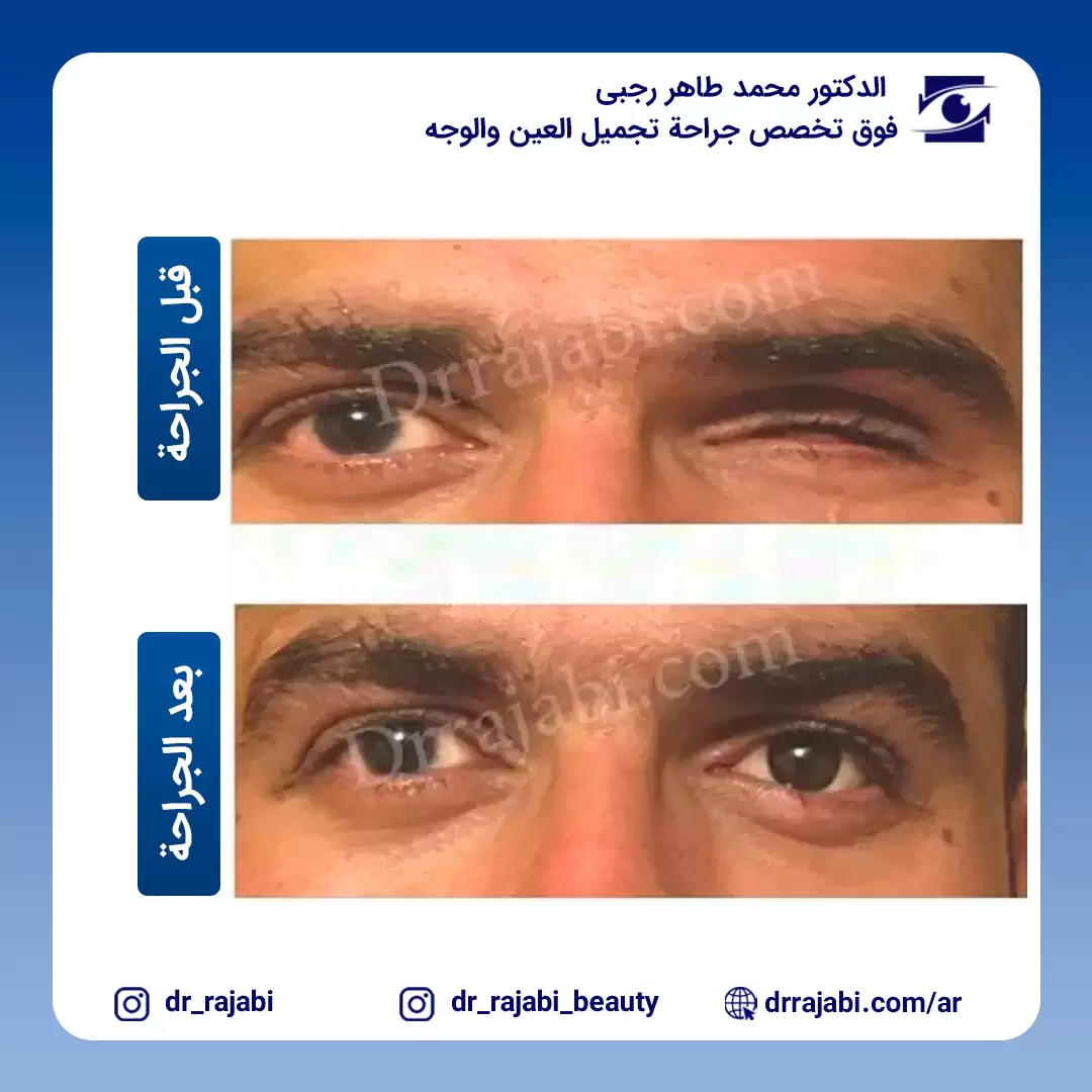 يرجى الأخذ في الإعتبار أن الجفن سيبدوا متدليا في الأشهر الأولى بسبب تفریغ العين و إنخفاض حجم الحَجاج أو ما يسمى بالإنجليزية (orbit)، سوف تتحسن هذه الحالة بعد تركيب الزرعة الإصطناعية.